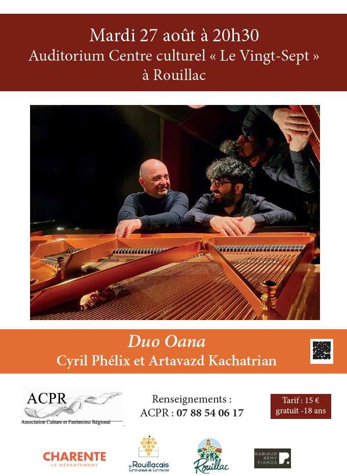 CONCERT PIANO + Ajouter à mon Agenda Google + iCal / Outlook export Date 27/Août/2024 Expired! Heure 20h30 - 23h00 Lieu Centre Culturel le Vingt-Sept Le Vingt-Sept, 139 Boulevard d'Encamp, 16170 Rouillac Partagez cet événement