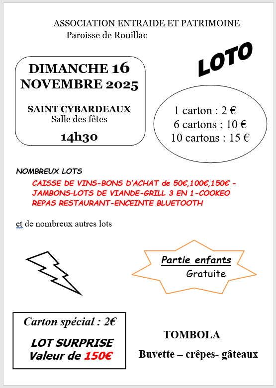 LOTO organisé par l’AEP (association entraide et patrimoine) à la Salle des fêtes de Saint-Cybardeaux + Ajouter à mon Agenda Google + iCal / Outlook export Date 16/Nov/2025 Heure 14h30 - 18h00 Partagez cet événement