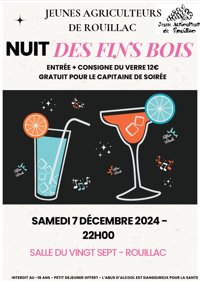 NUIT DES FINS BOIS + Ajouter à mon Agenda Google + iCal / Outlook export Date 07 - 08/Déc/2024 Expired! Heure 22h00 - 4h00 Lieu Centre Culturel le Vingt-Sept Le Vingt-Sept, 139 Boulevard d'Encamp, 16170 Rouillac Organisateur Jeunes Agriculteurs Partagez cet événement