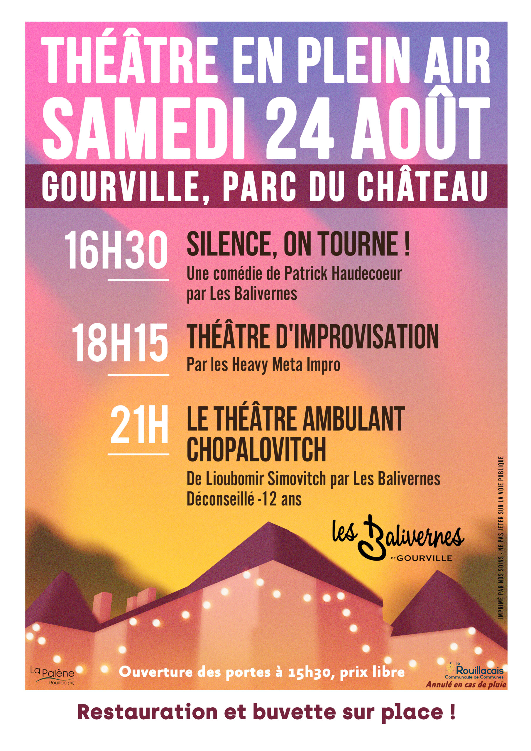 THEATRE + Ajouter à mon Agenda Google + iCal / Outlook export Date 24/Août/2024 Expired! Heure 16h30 - 23h00 Lieu Château de Gourville Organisateur LES BALIVERNES Téléphone 05 45 96 52 17 Partagez cet événement
