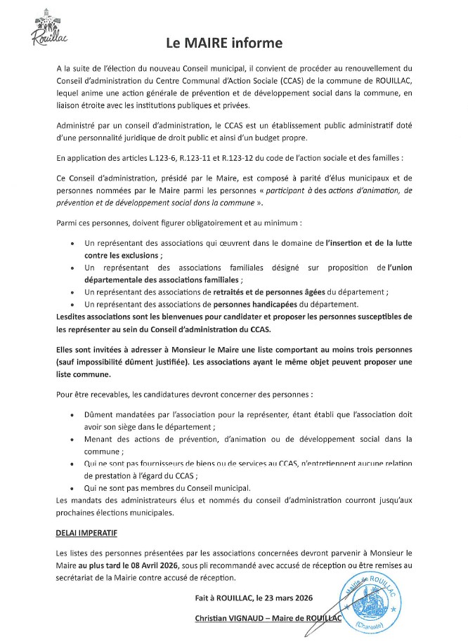 Le Centre Communal d’Action Sociale, ou CCAS est un établissement public communal, distinct de la Mairie qui fonctionne dans les locaux de la Mairie avec son propre règlement.